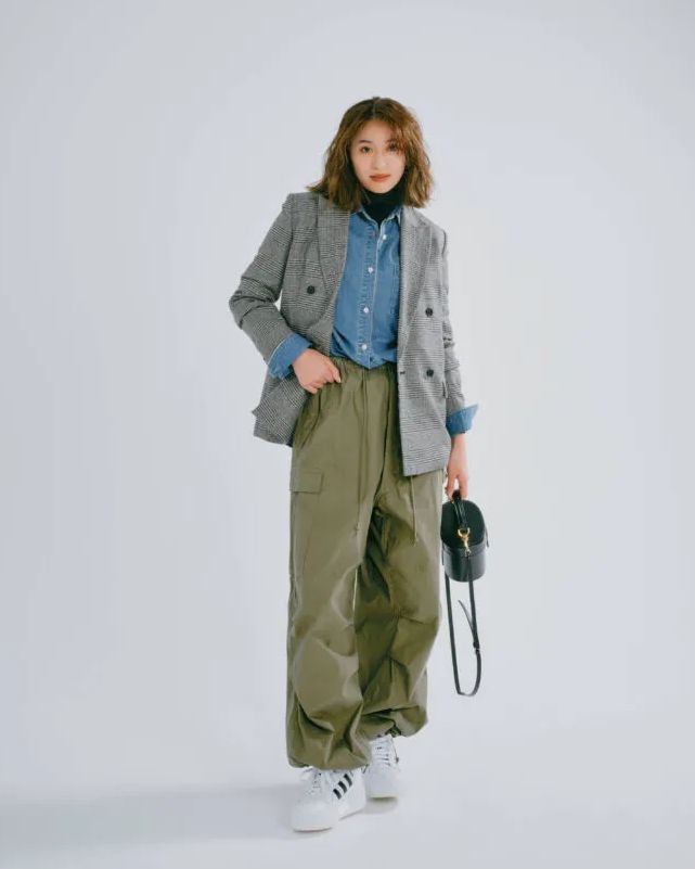 ボリュームあるシルエットのパンツなら、厚底スニーカーを好バランスで履きこなせます。トップスはシャツ&ジャケットのレイヤードでスマートに。よそ行きコーデも今っぽくカジュアルダウン。
