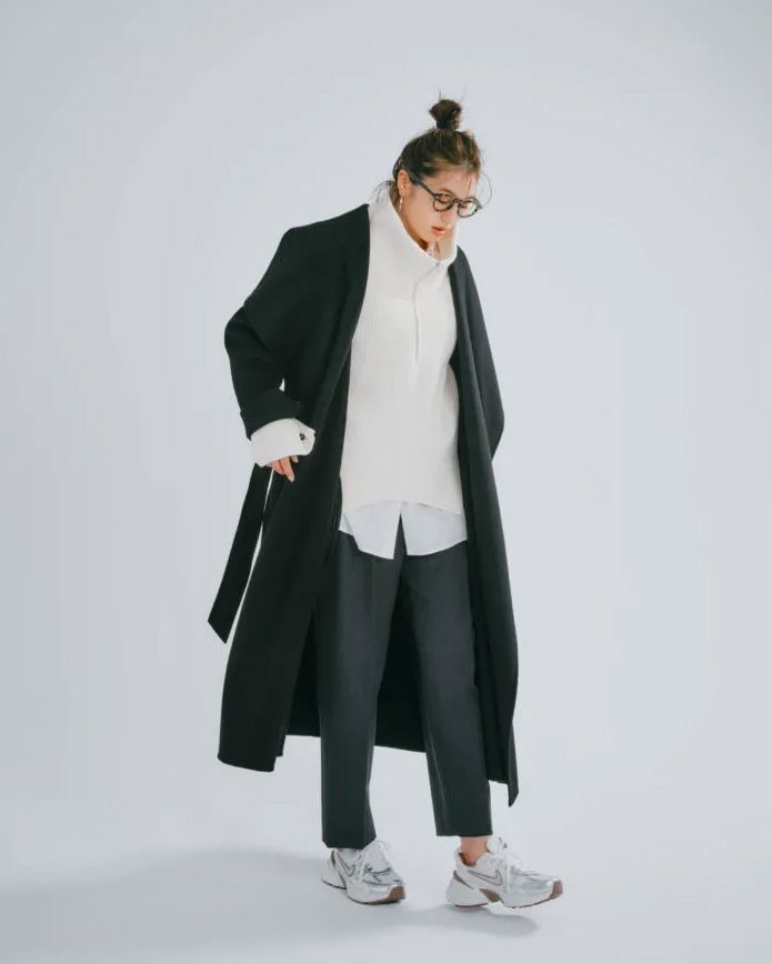 ニット×レザーの素材違いを取り入れるのが着こなしのコツ。エクリュカラーのステンカラーコートを羽織れば、切れ味レザーパンツを優しく緩和してくれます。白ベースのマルチカラースニーカーで、コーデを足元から盛り立てて。