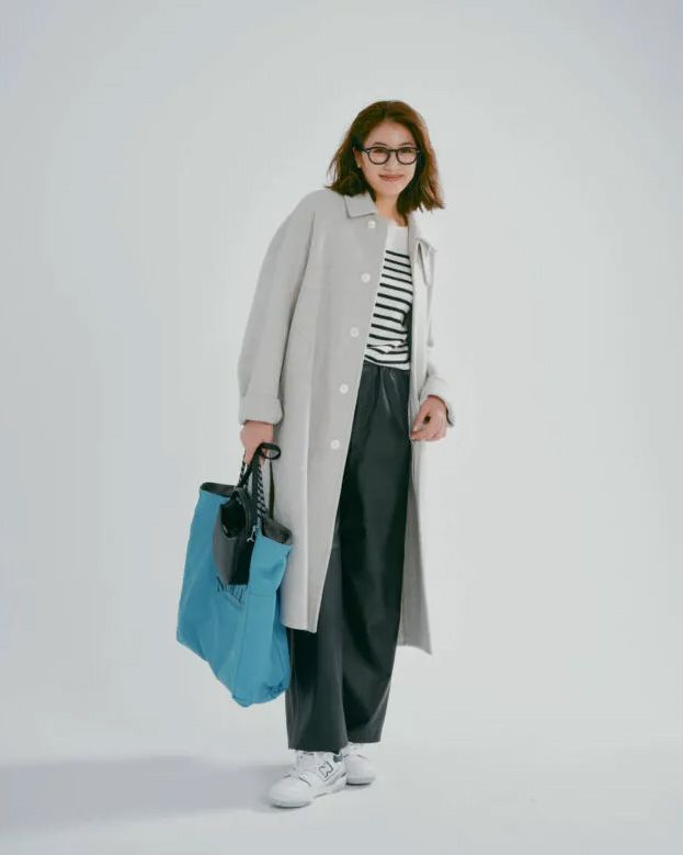 スニーカー「BB550WCA」¥17,600(ニューバランス/ニューバランスジャパンお客様相談室)コート¥121,000(ロエフ/エイチ ビューティー&ユース)ニット¥29,700(マルティニーク/マルティニーク ルミネ横浜)パンツ¥19,800(ユナイテッドアローズ/ユナイテッドアローズ 丸の内店)ショルダーバッグ¥4,990(マンゴ/ロコンド)トートバッグ¥15,400(ノマディス)めがね¥42,900(モスコット/モスコット トウキョウ)ソックス¥990(靴下屋/タビオ)