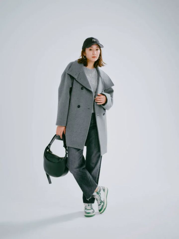 スニーカー「メダリスト」¥37,400(オートリー/トヨダトレーディング プレスルーム)コート¥37,950(アンクレイヴ スタンダード/アンクレイヴ)ニット¥19,800(ユナイテッドアローズ/ユナイテッドアローズ 丸の内店)デニムパンツ¥29,700(ヤヌーク×ジーンズ ファクトリー/ジーンズ ファクトリー 卸団地本店)バッグ¥27,500(ロウェル シングス/アバハウスインターナショナル オンラインストア)キャップ¥5,060(ニューエラ)ピアス¥8,400(アビステ)