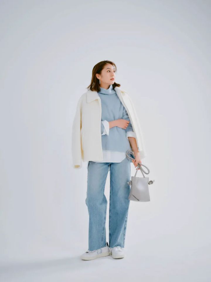 ホワイト&ブルー系にまとめた、これぞ冬のカジュアルデニムコーデ。デニム×スニーカーのコンビでも、色使い次第でトーンをまとめればきれい見えが叶います。