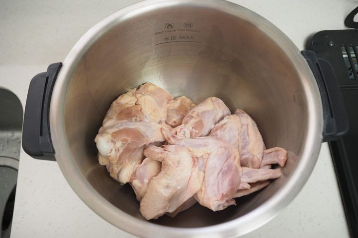 ホットクックの内鍋に、手羽元、手羽先を入れます。写真の分量は、5人家族で約800g。
