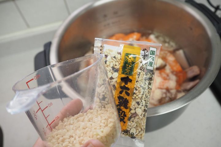 米を約1/2カップ入れます。本格的な参鶏湯には「もち米」を使いますが、わが家ではとくにもち米を常備しておらず、白米、玄米、雑穀米などで代替することが多いです。