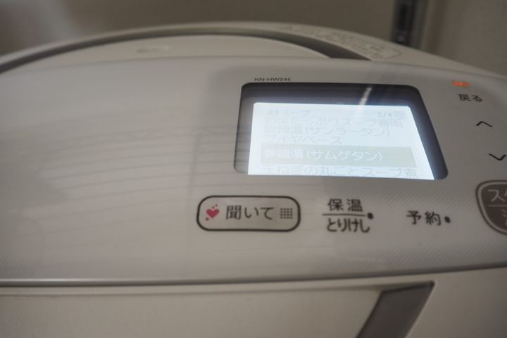 ホットクックの自動モードで「参鶏湯」を選び、調理開始。予約機能もあるので、日中にセットして、夜はアツアツを食べるだけにしておくこともできます。