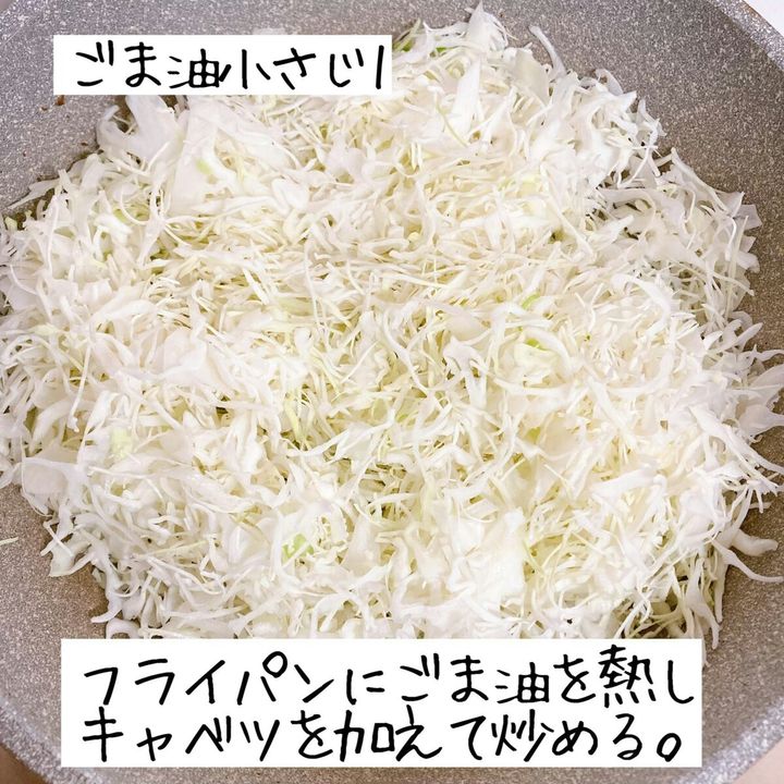 フライパンにごま油を熱し、キャベツを加えて炒める。