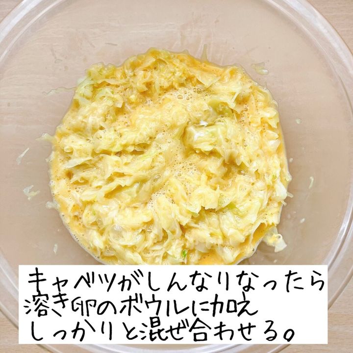 キャベツがしんなりなったら①のボウルに加えて混ぜる。