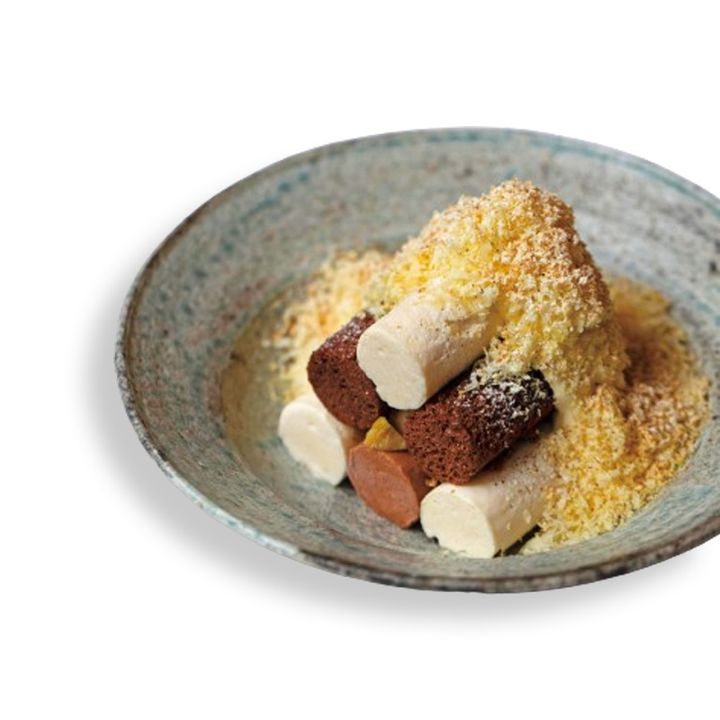 日本各地で海藻が激減する昨今、海藻の陸上・海上それぞれでの栽培や商品・料理開発までを一貫して行うレストランの一品。サロショで出合えるのは、モンブランの新解釈とも言える斬新なデザート。さまざまな食感の違いの面白さ、熟成させた栗や熟成昆布の旨みや香ばしさとチョコレートのコクの三位一体を楽しんで。海のモンブラン(1皿)¥3,630