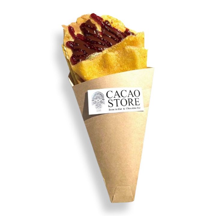 日本のショコラティエを牽引する「ミュゼ・ドゥ・ショコラ テオブロマ」の土屋公二氏がオーナーを務める、ビーントゥバーをコンセプトにしたチョコレートのセレクトショップ「カカオストア」からは、クレープが登場。小規模農家の豆を使用したダークチョコとフランボワーズの自家製ジャム入りのクレープに心もとろけるはず。ショコフランボワーズ(1個)¥801