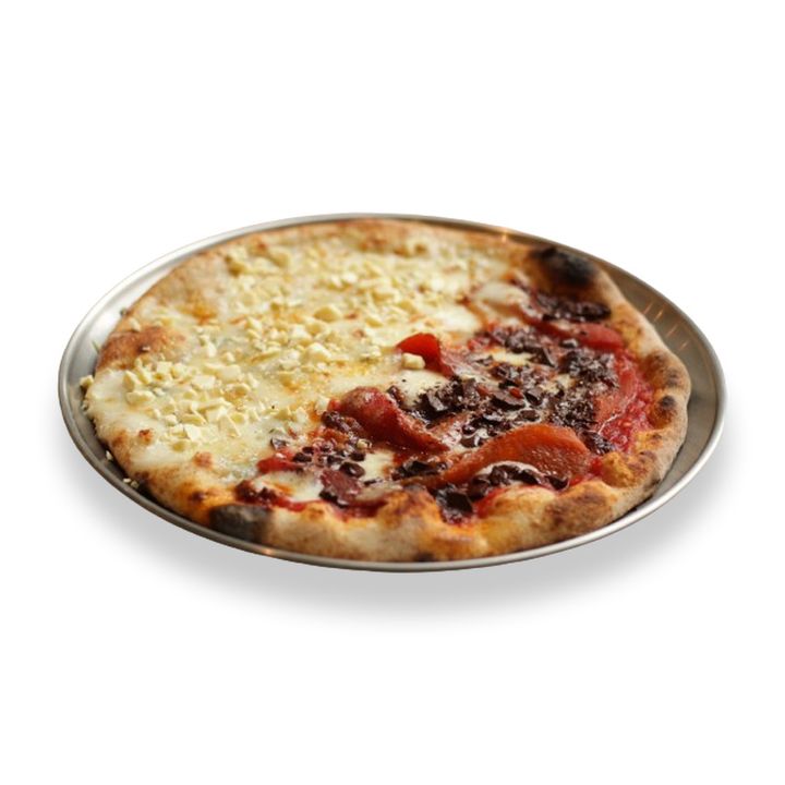 ピザの半分は4種類のチーズとホワイトチョコレート、もう半分はトマトベースでモッツァレラや辛口の豚のサラミ、“ンドゥイヤ”とパプリカのマリネをトッピング。甘いもしょっぱいもどちらも味わえる欲張りな一枚。テイクアウトもできます。ハーフ&ハーフピザ〜クアトロフォルマッジ/ンドゥイヤ・パプリカ・トマト〜(1皿)¥3,520