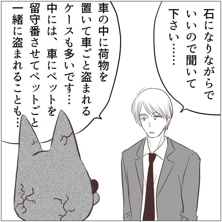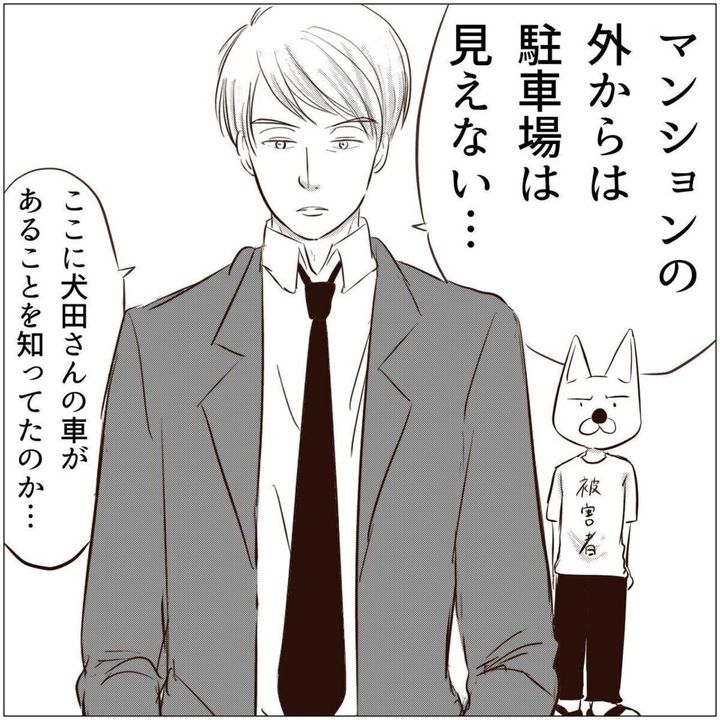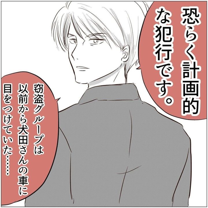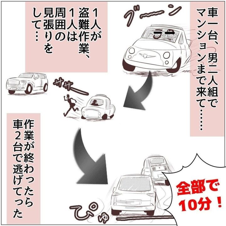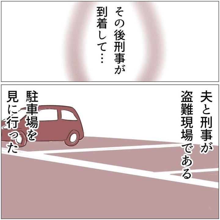 刑事とともに駐車場の立地や監視カメラの確認をした夫。そこで、事前に犯人たちは下見をしていただろうという驚きの事実を知ります。さらに、ものの10分ほどで車が盗難にあっていたことから到底太刀打ちできないと感じます。