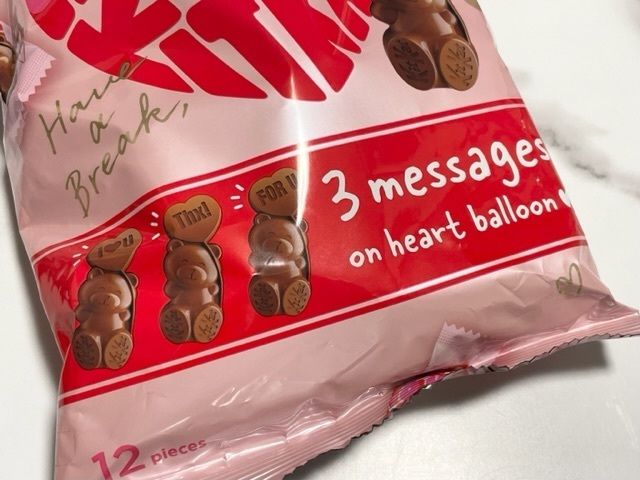 チョコレートバーのクマが手に持つハート型バルーン部分には、気持ちの伝わるメッセージが描かれています。