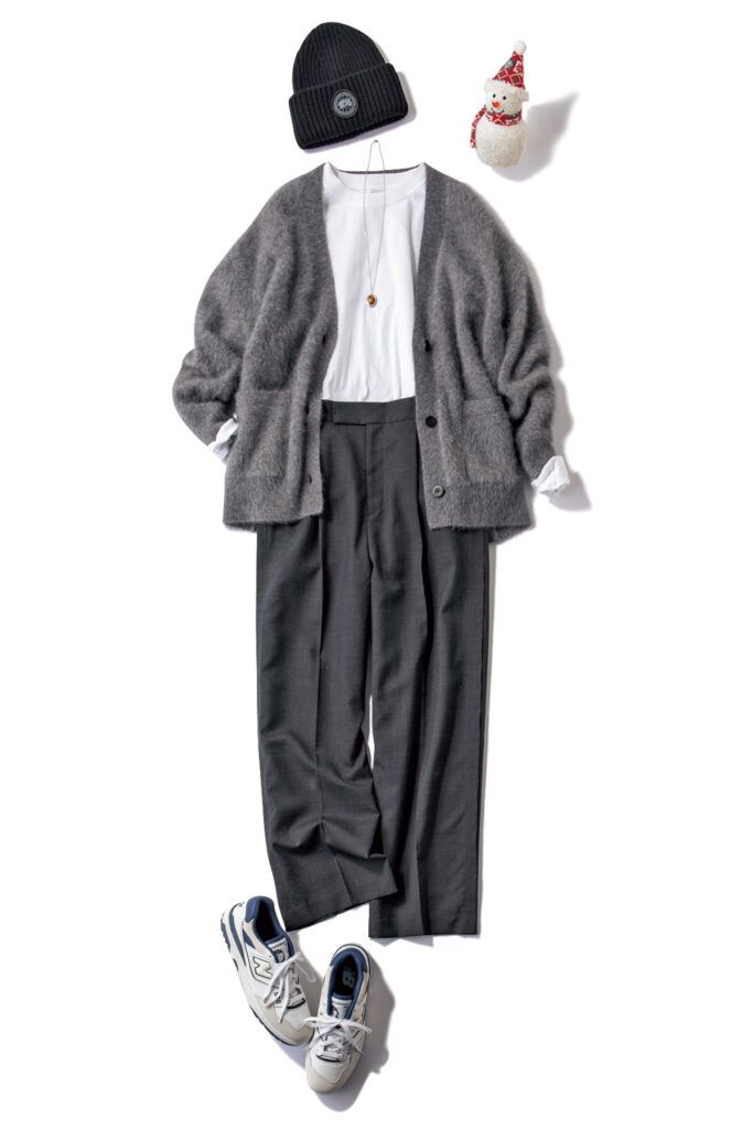 グレーワイドパンツ着回し ロンT¥2,860(ヘインズ/ヘインズブランズ ジャパン カスタマーセンター)グレーカーデ¥29,700(ユナイテッドアローズ/ユナイテッドアローズ 渋谷スクランブルスクエア店)帽子¥35,200(カナダグース)スニーカー¥17,600(ニューバランス/ニューバランス ジャパンお客様相談室)ネックレス¥60,500(マリハ)