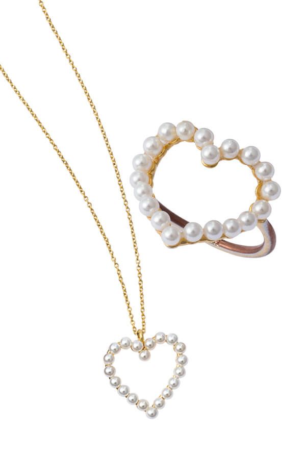 ベビーパールを使用しているので、ハートモチーフでも主張しすぎず大人レディにもしっくり。リングは指に沿う美シルエット。ネックレスはスライド金具で長さ調整可能。