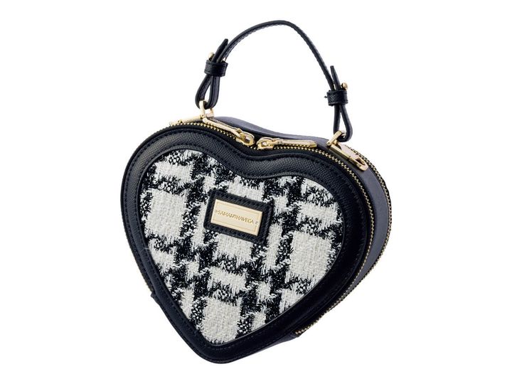 トレンドのツイードを、ハート型のバッグでコーディネートに投入! ラメ糸が織り込まれたツイード生地で、華やぎも十分♡