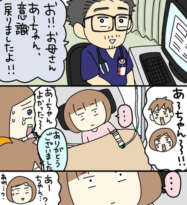 20分ほど待合室で待っている間、夫も病院へと到着。あーちゃんの回復を今か今かと待っていました。「意識が戻りましたよ!」と言われ、ようやくあーちゃんに会えたことで、安堵の表情へと変化したようです。子どもの顔を見ないと不安な気持ちを消すことはできないですよね。顔色もすっかり戻った様子のあーちゃん。安心したものの、かとさんは何か違和感を抱いている様子…。