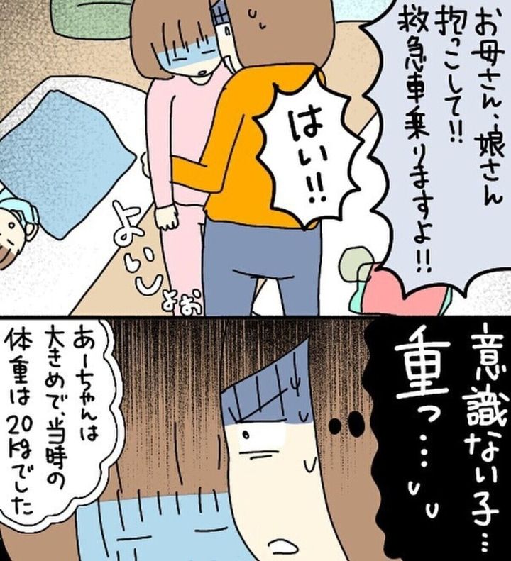 救急車が到着し、抱っこして救急車まで運ぶよう指示を受けたかとさん。しかし、あーちゃんは5歳児でも大きめの20キロ。さらにこの時は意識がなくぐったりとした状態で、抱っこしようにもその重さがずっしりとのしかかってきていました。