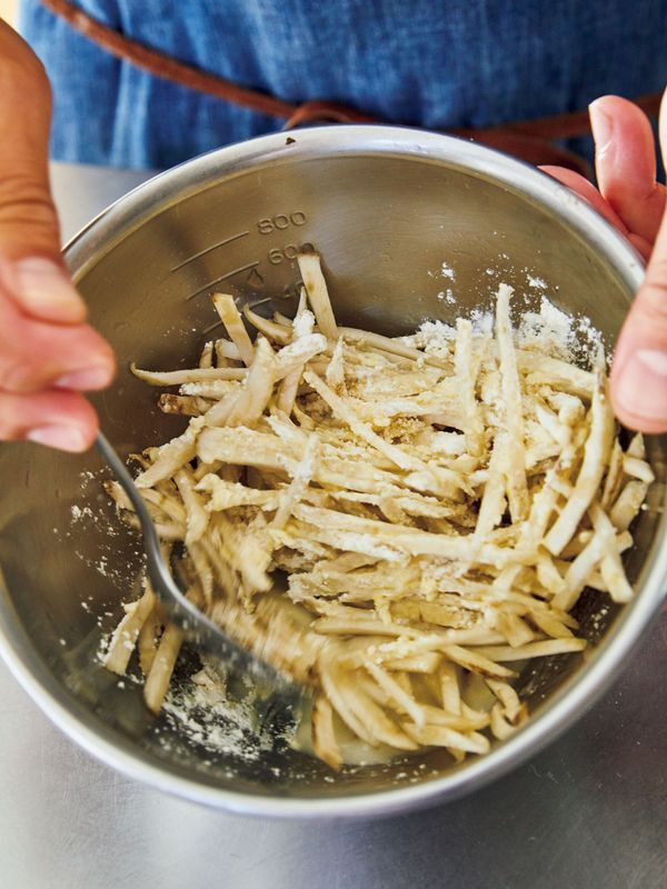 ボールに天ぷら粉と水大さじ2を入れて混ぜ、ころもを作る。ごぼうを加え、上下を返すようにして混ぜ、全体にころもをからめる。
