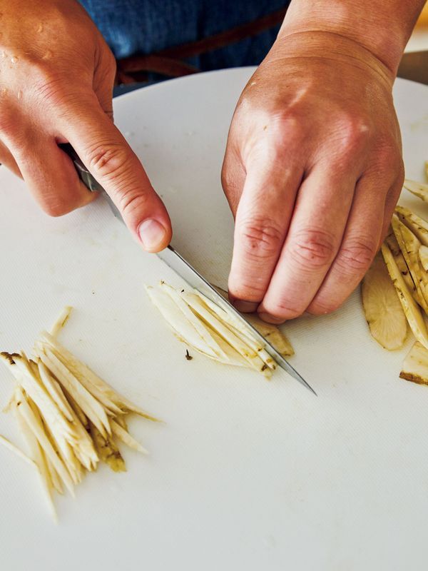 ごぼうは包丁の背で皮をこそげ取り、長さ10cmくらいの斜め薄切りにして重ね、端からせん切りにする。水に15分ほどさらし、ざるに上げてしっかりと水けをきる。