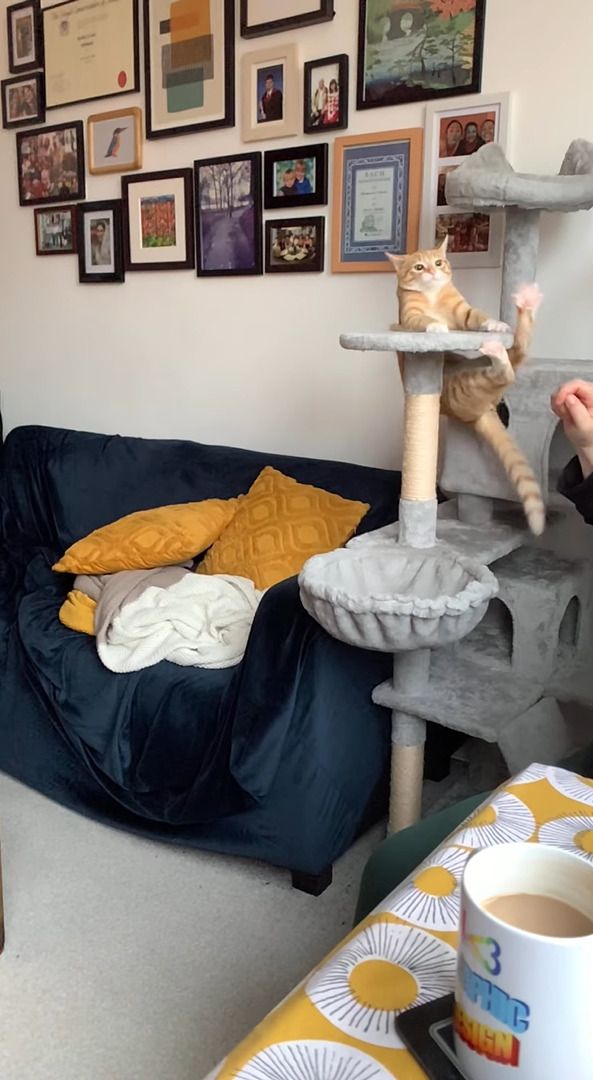 ソファの上のクッションの影に隠れているこの子がビーンズです。 飼い主さんがキャットタワーの上に手を出し、ビーンズの気を引くと・・・