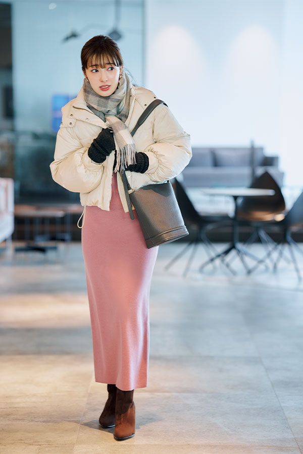 ショートダウン¥20,900/リリアン カラットニットアップ¥19,800/SNIDEL バッグ¥5,940/カシュカシュ(アンビリオン)ブーツ¥44,000/銀座かねまつ(銀座かねまつ6丁目本店)イヤリング¥1,870/アネモネ(サンポークリエイト) ストール¥3,850/グローブ(ワールドプレスインフォメーション) 手袋¥1,490/GU