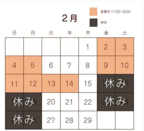 ※2月に休業日があります。13・14日は通常定休日ですが営業されます。