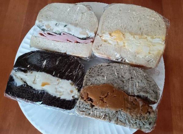 左上から時計回りに *プレーンベーグル×ネギ&いぶりがっこチーズ *プレーンベーグル×たまご *ココアベーグル×ゆずクリーム *アールグレイベーグル×生キャラメルくるみ ※ベーグルもサンドの中身も手づくり