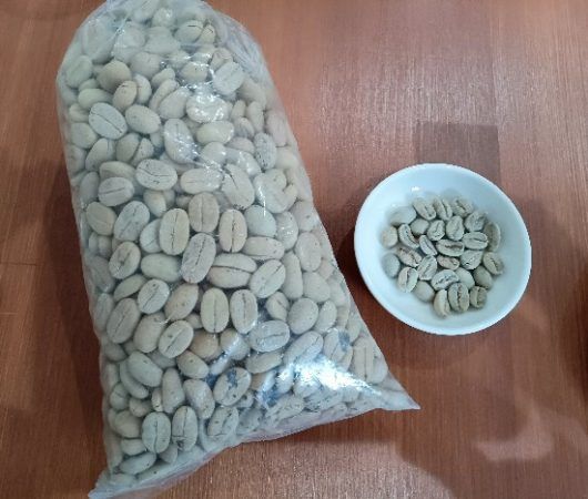 左は殻付きのパーチメントコーヒーと呼ばれる言わば半製品だそうで、2023年8月民泊した際に生産者から直接いただいたものだそう…右が焙煎出来る状態になった生豆。大きさが違いますね。