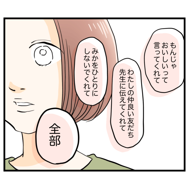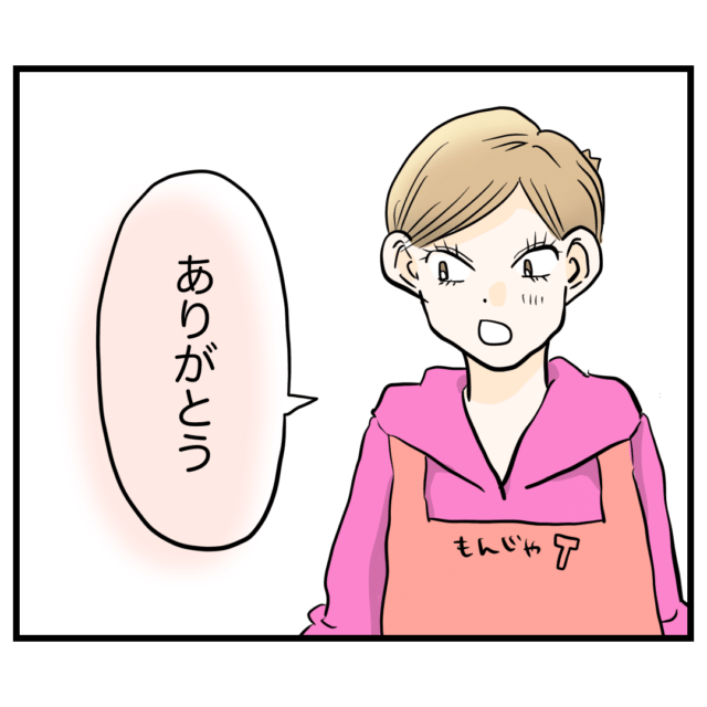 思いがけず、みかちゃんママにご飯に誘われたあんころさんは、みかちゃんママの実家であるもんじゃ焼き屋さんに来ました。初めてのもんじゃが美味しくて、それを伝えると照れ隠しなのか「べつに!」とまくしたてたみかちゃんママでしたが、最後にまさかの「ありがとね」と言ったのでした。
