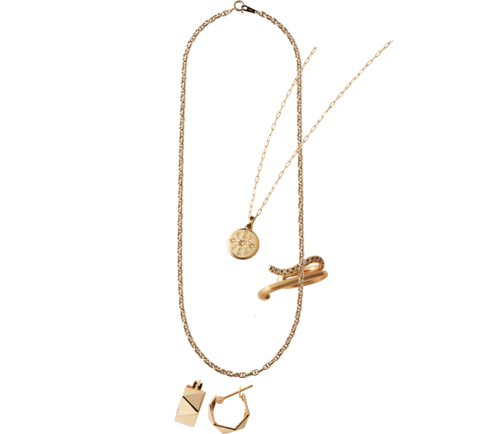 長さ違いで合わせたネックレスで、胸元にボリュームと輝きを。上から:ネックレス〈ロロマリーナチェーン〉[K10YG]¥44,000(シエナ ロゼ/シエナ ロゼ 表参道ヒルズ店)、ネックレスチェイン[K18YG]¥110,000、ネックレスに付けたチャーム[K18YG×DIA]¥187,000(共にスタージュエリー/スタージュエリー表参道ヒルズ店)、イヤ-カフ[K10YG×ブラウンDIA]¥33,000(エテ ビジュー)、ピアス〈ジオメトリーフープピアス〉[K18YG×K10YG]¥39,600(テイクアップ)