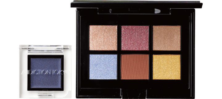 右から:幻想的なパレット。ホリデーアディクション アイシャドウ パレット “アンノウン ファミリア” Look Closer ¥7,480、シアーなネイビーブルー。ザ アイシャドウ マルチ ティント Night Groove ¥2,530(共にアディクション ビューティ・数量限定品)