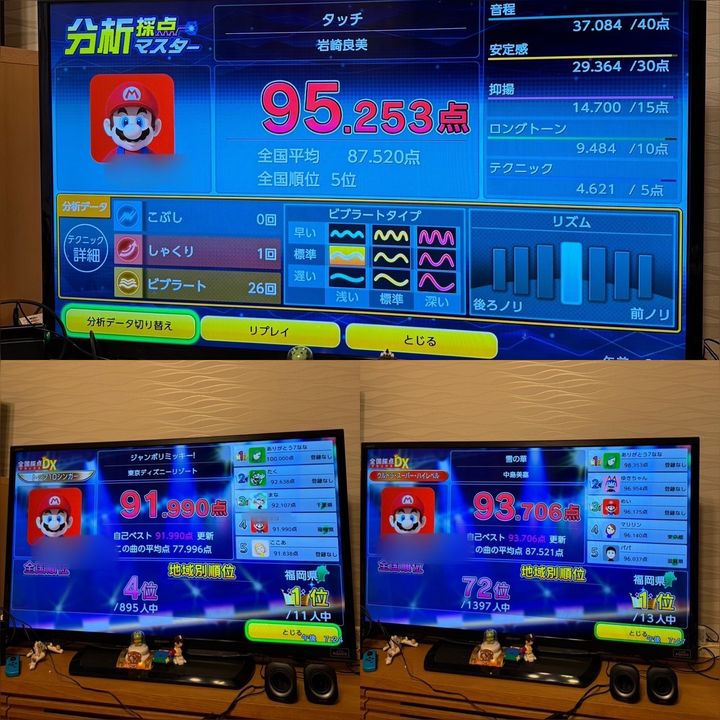 ただし、アップテンポの曲で、言葉が多い曲はやはり採点ゲームには影響するようです。本当のカラオケで90点超える曲も、Switchだとなかなか出ません。タッチ、ジャンボリミッキー、雪の華は、高得点でました。