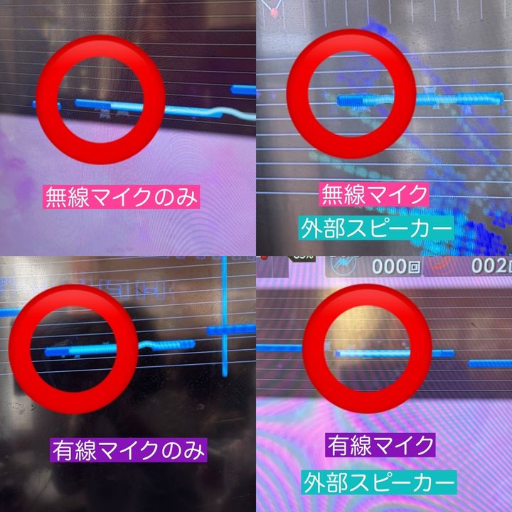 マイクとスピーカーの組み合わせで、4通り採点ゲームの音程バーで、どのくらい声の遅延があるか試してみたので、参考までに。