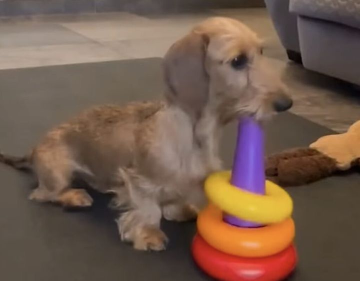 「こんなの簡単だよー!」輪投げで遊べる賢い犬さん。