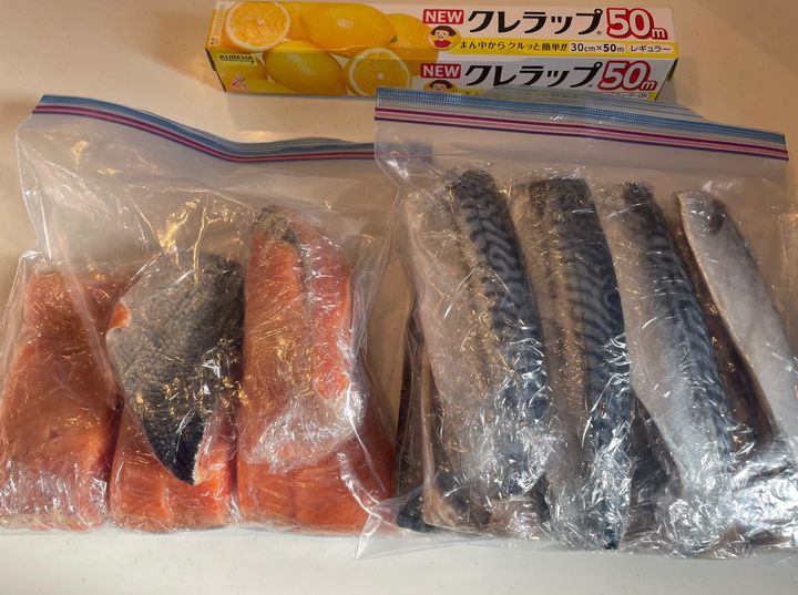 銀鮭と塩さばは、そのままひとつずつラップに包んでジップロックへ入れたものを冷凍保存しています。食べたいときに冷蔵庫で解凍し、フライパンで焼くだけなので準備が本当に楽ちんです。夜ごはんを用意するのが面倒くさいな〜と思う日も、この魚たちが冷凍庫にさえあれば、焼くだけで立派な栄養満点おかずになるので重宝しています。