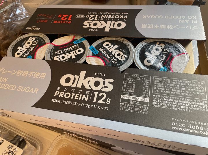 よっつめは…「オイコス プレーン砂糖不使用」です。こちらも定番ですね。スーパーで買うより断然お得です!わが家は一度に2ケース(12個×2)購入し、毎朝夫婦でひとつずつ食べています。プレーンタイプなので、好きなジャムやきな粉蜂蜜などかけて味変を楽しんでいます。