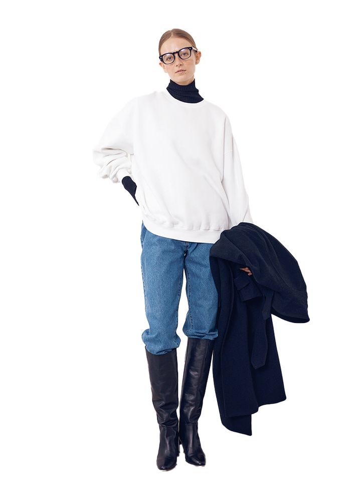 トップスは、黒ニットにスエットを重ねたモノトーン仕立て。スエットはジャケットやコートの下にも着込める程度のゆったり感。タートルニットとの相性もよく、裏起毛であたたかさもありながら、手入れもイージーなタイプ。今から選ぶなら、春まで着れる軽快な色味をチョイス。