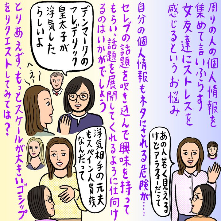 もしくは海外セレブやロイヤルの話題もスケールが大きいのでテーマとしては盛り上がります。世界は広いので、そのお友達は、半径数メートルの友人知人よりも大きな話題に目を向けてほしいですよね。もしくは朝ドラの話題なら、言われた人は迷惑にならないので良いかもしれません。