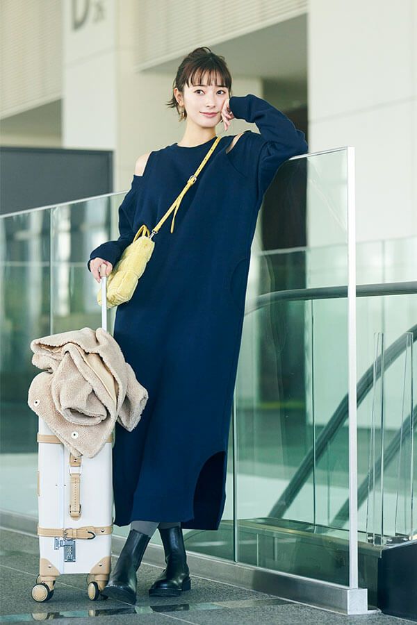くつろいで過ごしたい長距離フライトは、着心地ラクチンなスウェットワンピを頼って。ネイビーと高相性のイエローバッグを差し色にすれば、ロングワンピののっぺり見えも回避。
