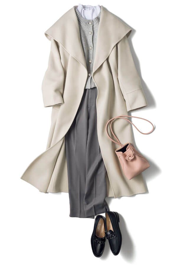 コート¥49,500/FRAY I.D カーディガン¥4,9 39/VIS トップス¥7,920/ミューニック(アンタイトル) パンツ¥9,900/ギャレスト(ワールド プレスインフォメーション) バッグ¥42,900/VASIC(ヴァジックジャパン) ローファー¥33,000/銀座かねまつ(銀座かねまつ6丁目本店)