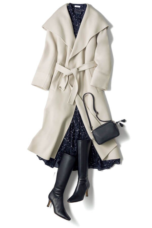 コート¥49,500、ワンピース¥31,900/ともにFRAY I.D バッグ¥37,400/VASIC(ヴァジッ クジャパン) ロングブーツ¥44,000/ダイアナ(ダイアナ 銀座本店)