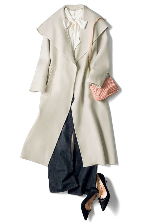 コート¥49,500/FRAY I.D ブラウス¥22,000/ソージュ(ソージュ オンラインストア) デニムパンツ¥8,789/VIS バッグ¥4,990/MANGO シューズ¥35,200/銀座かねまつ(銀座かねまつ6丁目本店)