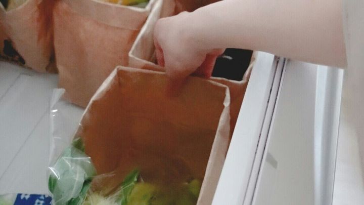野菜室で使っているセリアの食品用ガゼットバッグ。バッグとバッグがずれないようにクリップでとめているのですが、このテープを貼って固定してみました。