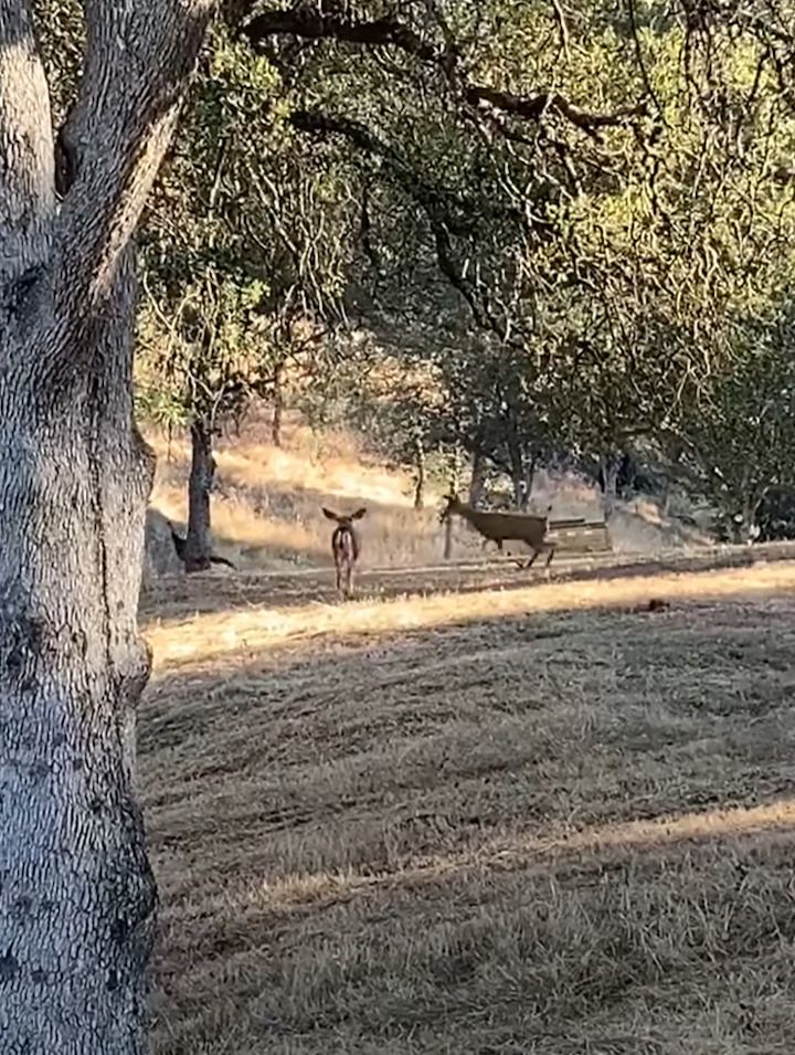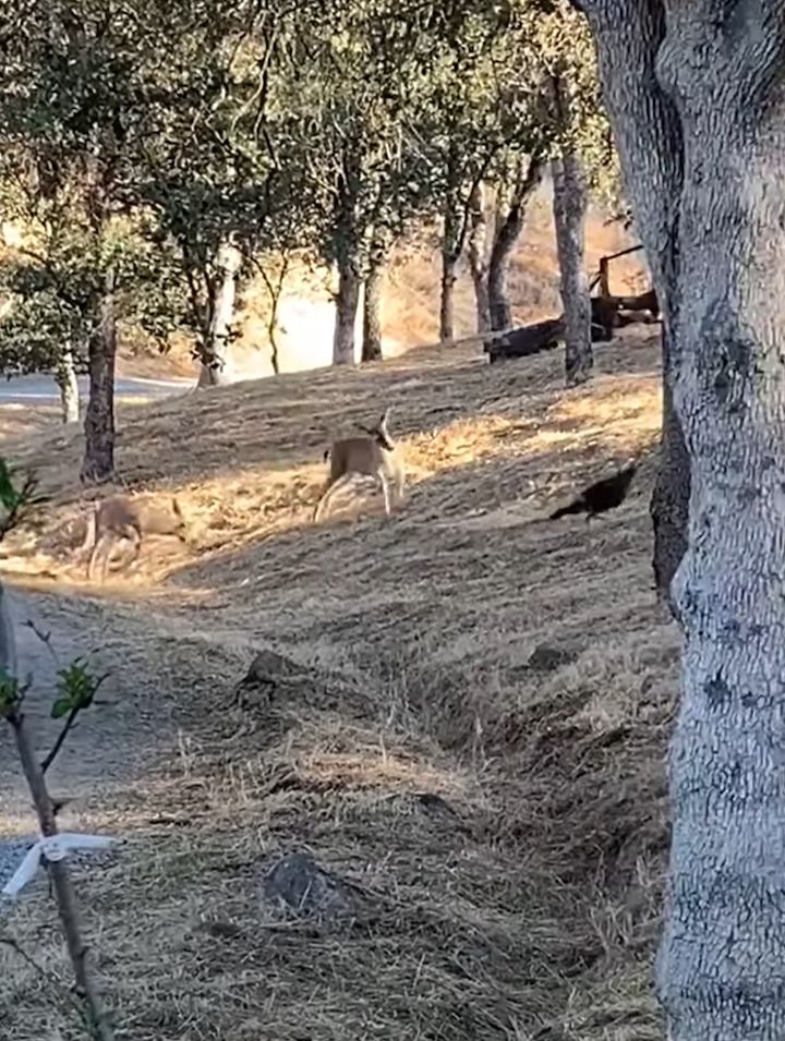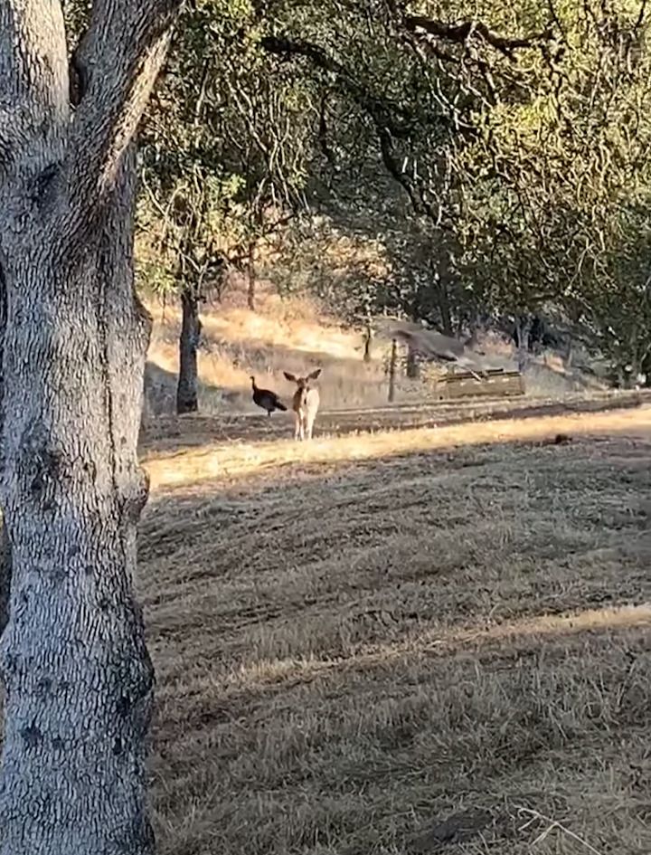 さらに、もう1頭のシカの姿も確認できます。 どうやら、2頭のシカは七面鳥を夢中で追いかけているようです。