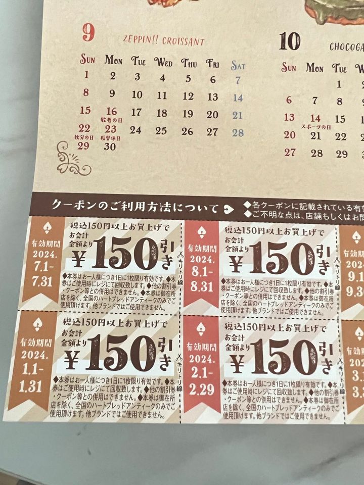 毎月使えるので150円×12ヶ月でこれだけで1800円だからクーポンだけでもプラスでお得!アンティークのパンはよく購入するのでこれは嬉しいです。店舗の限定などもないのでどの店舗でも使用可能。わたしは毎年、半年ごとにカットしてお財布に入れてます。