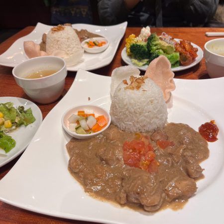 鶏肉のルンダン・牛ホホのルンダンがおすすめメニューだそうで、鶏肉のルンダンを注文しました。インドネシアの伝統料理「ルンダン」は、アメリカCNN放送局にて2017年「世界一美味しい料理」を決める投票で第1位に輝いた料理だそうです。鶏肉のルンダンは、鶏肉がとてもトロトロしていて、口の中に入れた瞬間美味しさが益々広がりました。インスタ映えするようなお洒落な盛り付けでした。