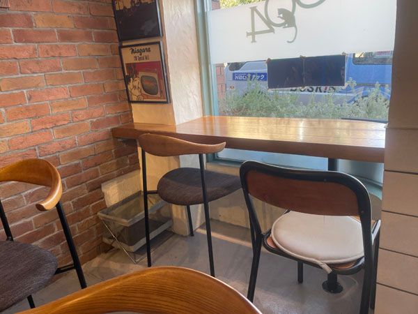 窓に面したカウンター席もあります。荷物かごもあるので安心。