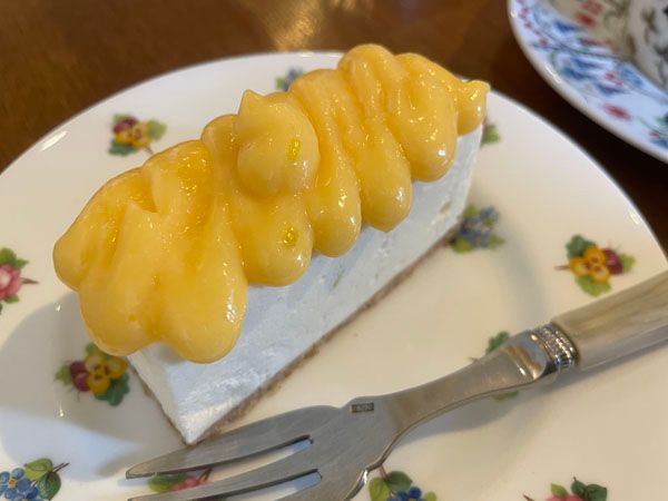 レアチーズケーキの上に、国産無農薬レモンの皮と果汁をたっぷり入れたレモンクリームがのっています。 とってもなめらかで、コクのあるチーズケーキとよく合います。