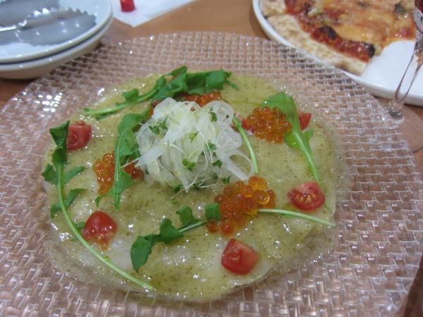 真鯛の薄切りに、美味しいソースがたっぷりかかっていて、香りのよいルッコラとミニトマト・オニオン・かいわれ、キラキラないくらがトッピングしてました。素材とソースのバランスが良くてとても美味しかったです。