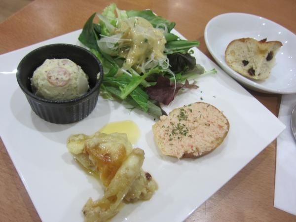 本日のランチを1つ頼んで、シェアして食べました。前菜4種の盛り合わせとフォカッチャです。サラダのドレッシングがさっぱりとして美味しかったです。ポテトサラダは、おしゃれな味付けでした。パスタのソースが美味しくて、あっという間に完食してしまいました。レーズンの甘酸っぱさが美味しいフォカッチャでした。