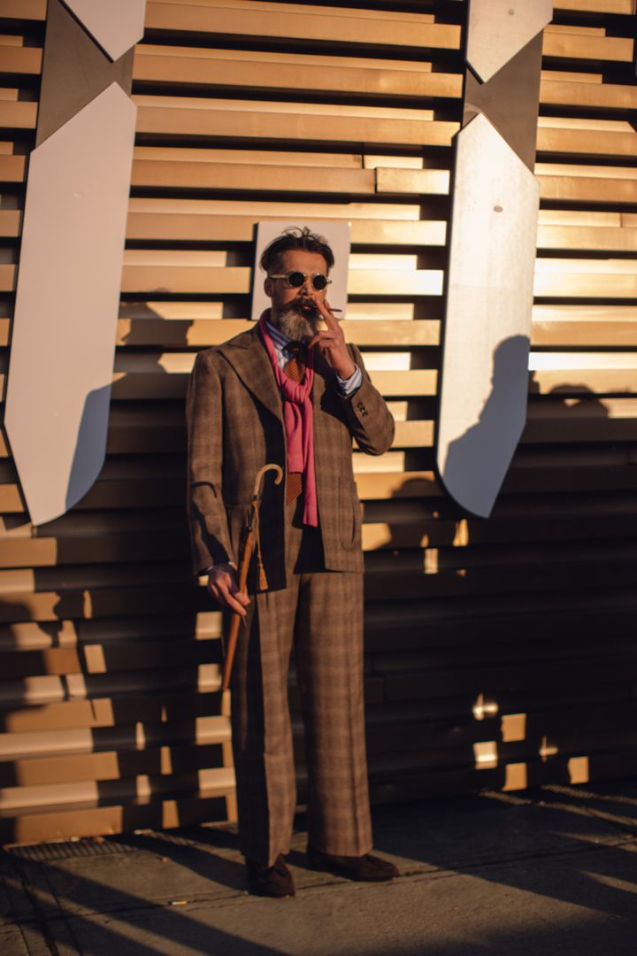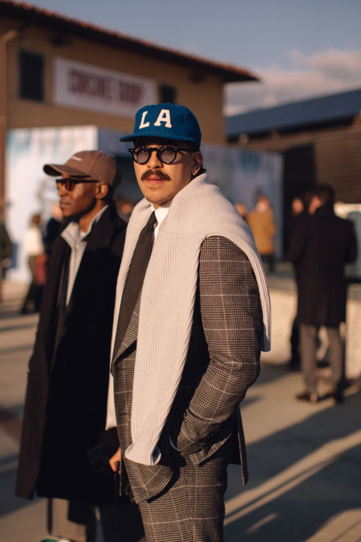 スーツにキャップを合わせるスタイルが多く見受けられた第105回目のピッティ・ウオモ。カーディガンの肩掛けは健在の様子!